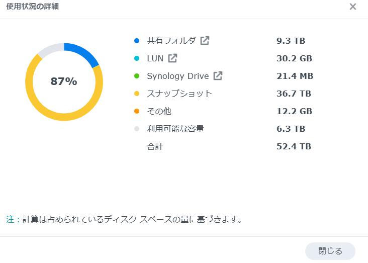 私もDS923+を20TBのHDD4本でSHR1で運用しており、合計52TBくらい使えるので、余裕で運用できるだろうと思っていたのですが、最近になって残り6TBしかないと警告が出るようになっていました。そこで、YouTube用に長回ししていたけど使わなかった素材などを少し消しましたが、全然回復しません。